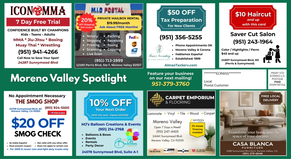 Whether you are a salon, real estate agent, home service provider, restaurant, boutique or startup ... this is a cost-effective, zero hassle way to advertise to your neighbors here in Moreno Valley.