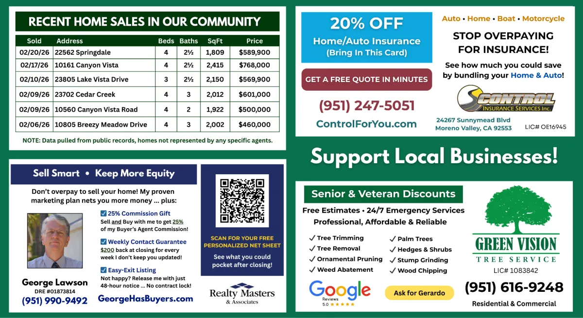 Every month, we send our big 6½x12 postcard to 2,500 homes in Moreno Valley ...